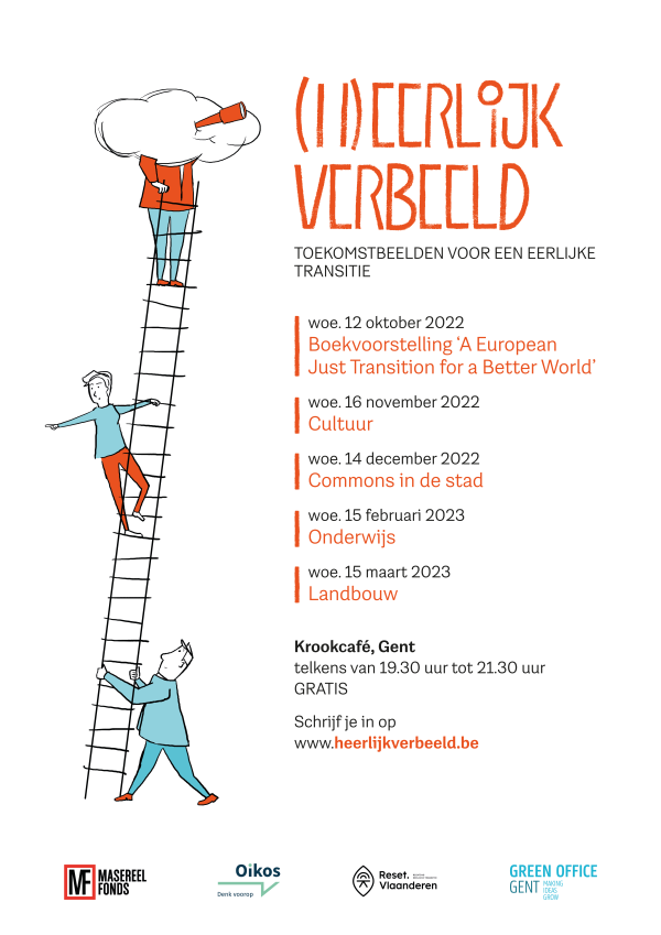We verwelkomen jullie op deze Verbeeldingsavond, in een serie van vijf avonden, telkens met input van een Verbeelder, een Doener en een Uitdager. De Verbeelder, vandaag Tine Heyse, laat haar verbeelding in een kort essay los op de mogelijkheden van stadslandbouw voor een betere toekomst. Deze utopie is aanleiding tot een gesprek met het publiek en twee andere gasten. De Doener, boer Kurt Sannen, draagt de laarzen in de modder en vertelt vanuit zijn concrete ervaring. De Uitdager, vandaag Barbara Van Dyck, schaaft en schuurt - want een utopisch beeld is mooi, maar de realiteit werkt soms tegen.